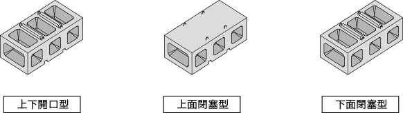B、D上型(A、C型の上面閉鎖)の形式があるので、上部プレキャスト版や底版ブロックが不要な経済断面が可能となります。また、直方体形状なので、下図のような応用型形式の構造が豊富に提供できます。